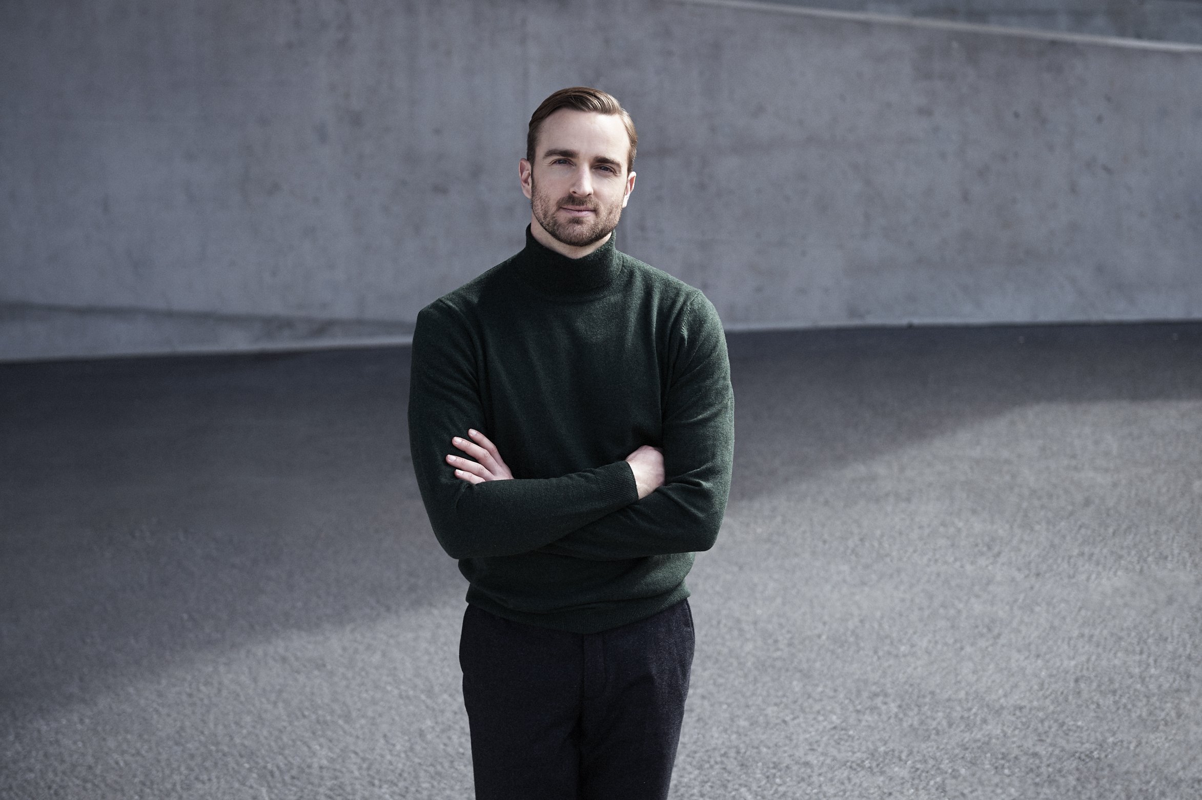 Mann in dunkelgrünem Rollkragenpullover vor grauem Hintergrund, die Arme vor der Brust verschränkt.