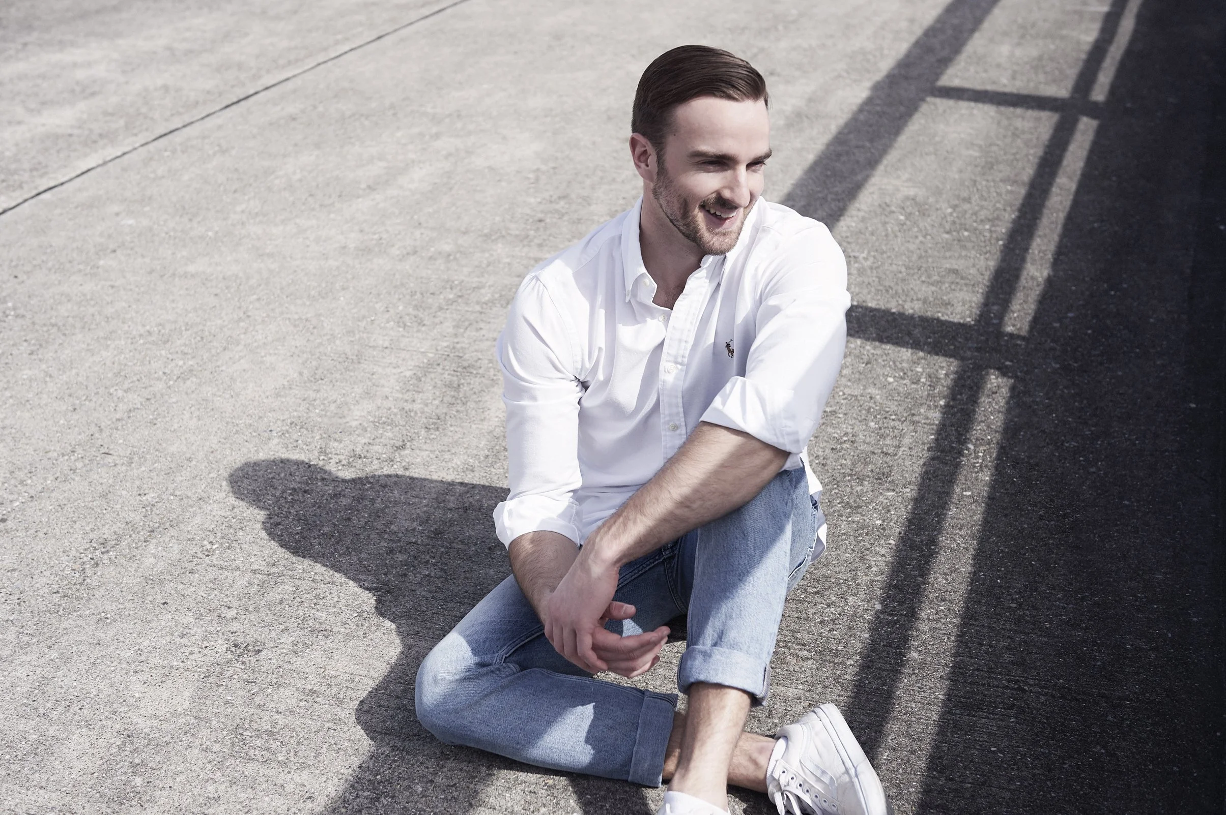 Mann in weißem Hemd und blauer Jeans sitzt lächelnd auf dem Boden.